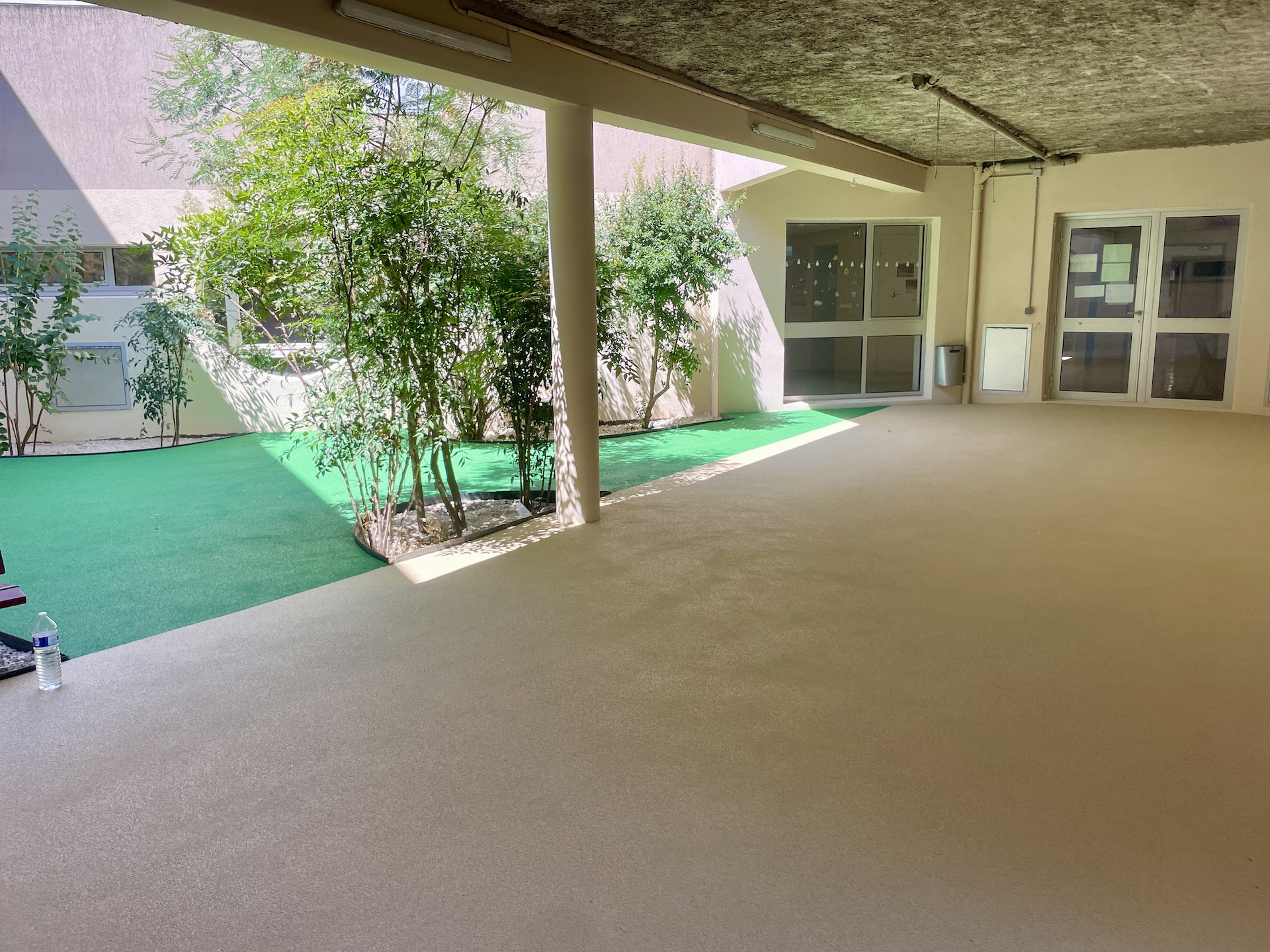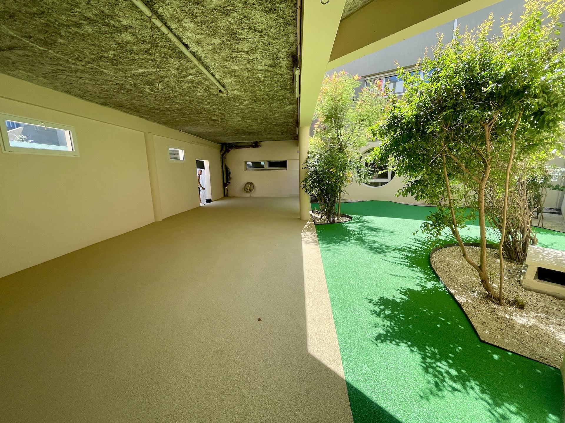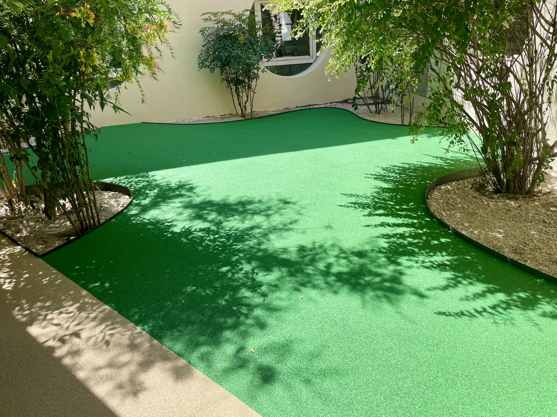 Ce patio a été repensé pour devenir un lieu de bien-être pour les mamans, les nouveau-nés et les enfants. Dans ce contexte sensible, la pose d’un revêtement de sol amortissant s’est imposée comme une solution idéale pour :
