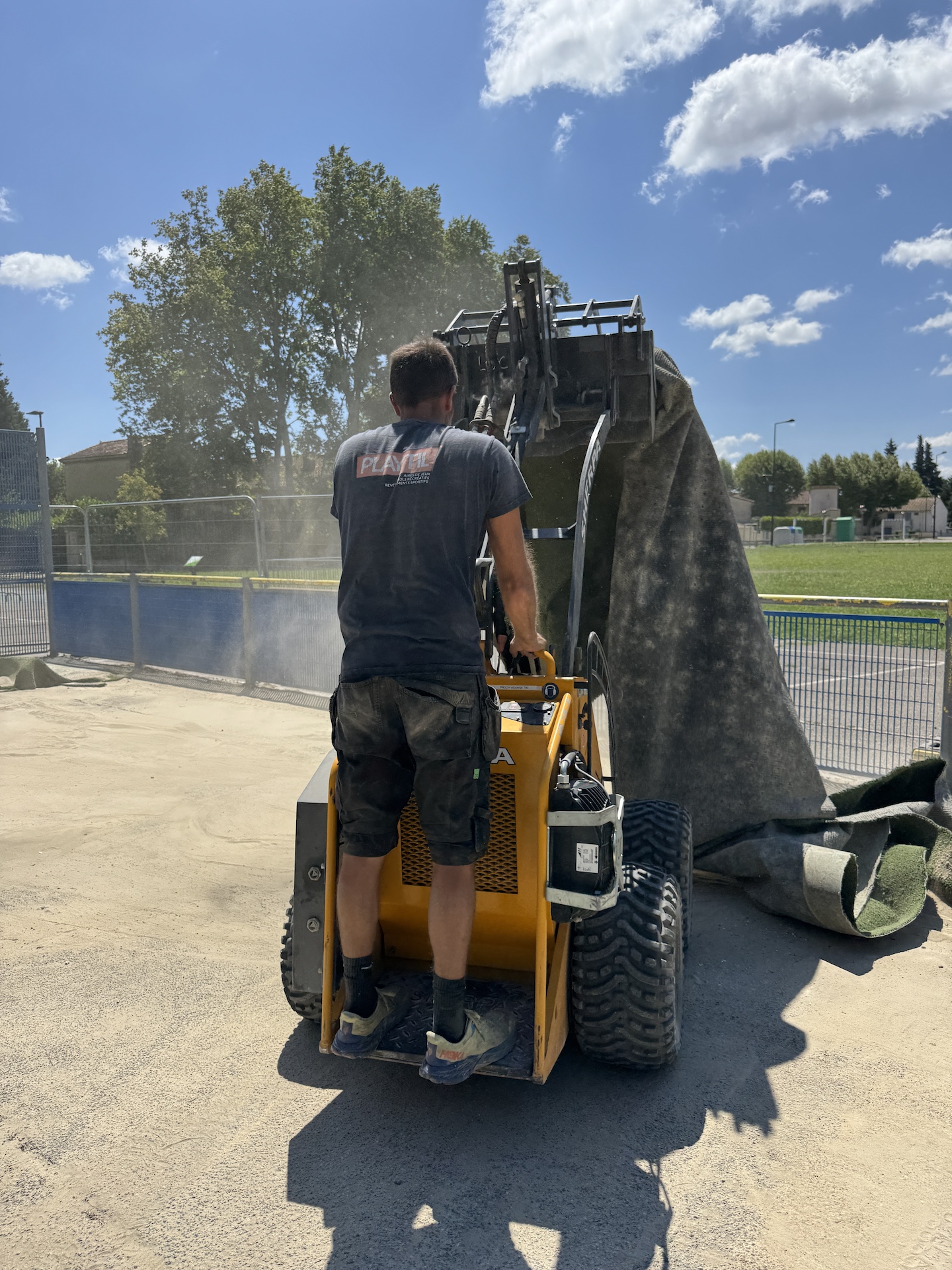 Dépose et évacuation du gazon synthétique existant en centre de tri agréé (décompactage du sable, découpe du gazon).