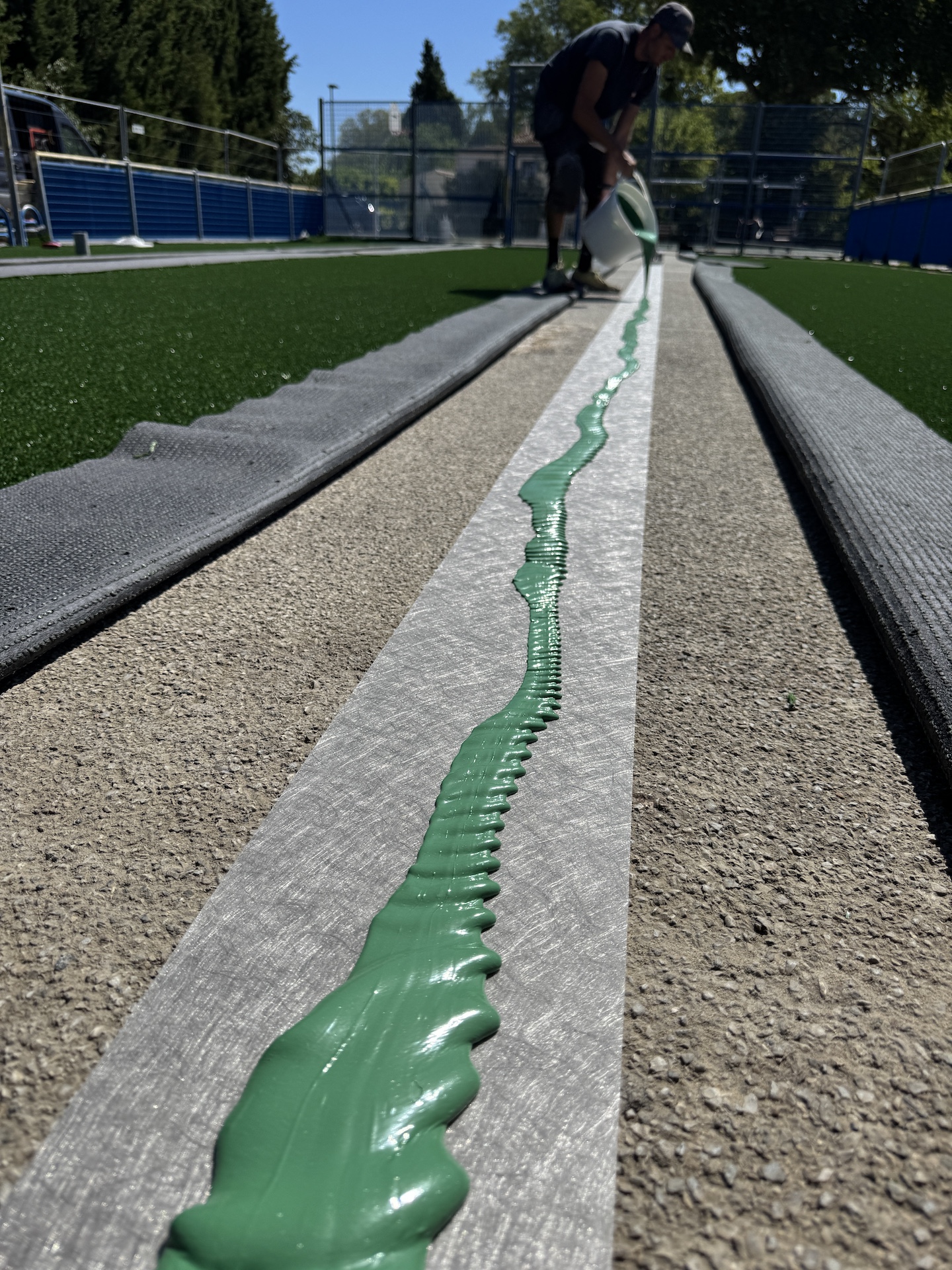 Le nouveau revêtement est posé avec soin : déroulage, ajustement, collage des bandes de jonction, lestage si nécessaire (sable). Les choix de matériaux sont adaptés à la pratique multi-sports et aux normes actuelles (perméabilité, absorption des chocs, résistance à l’abrasion).